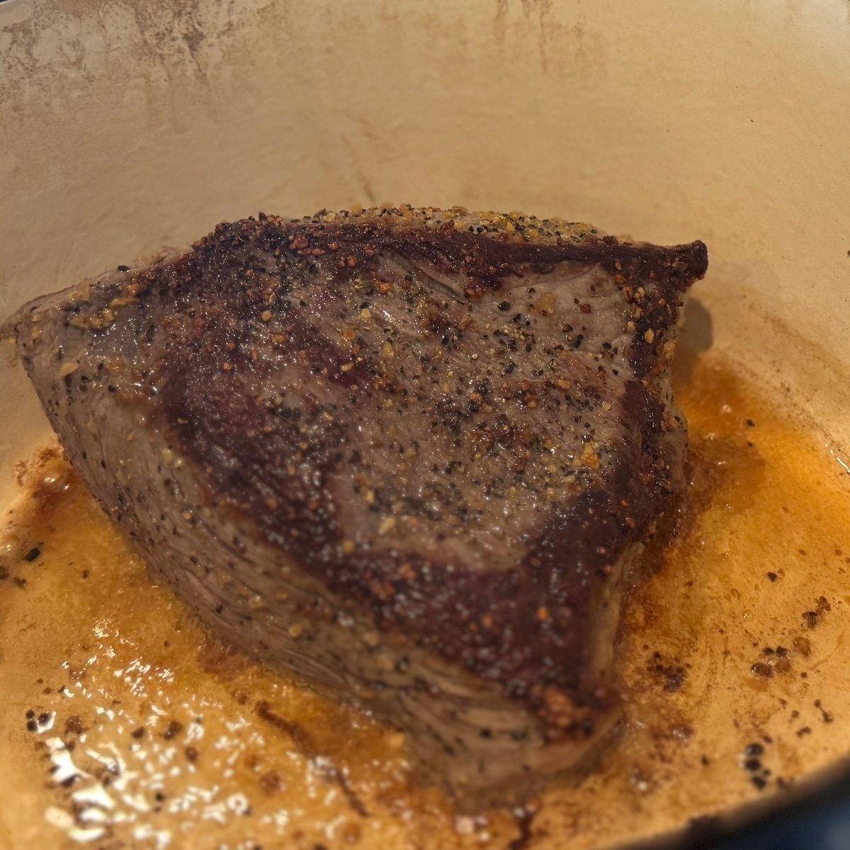 - Sear the seasoned roast on all sides until 3-4 minutes till nicely browned. Remove the roast from the Dutch oven and set it aside.