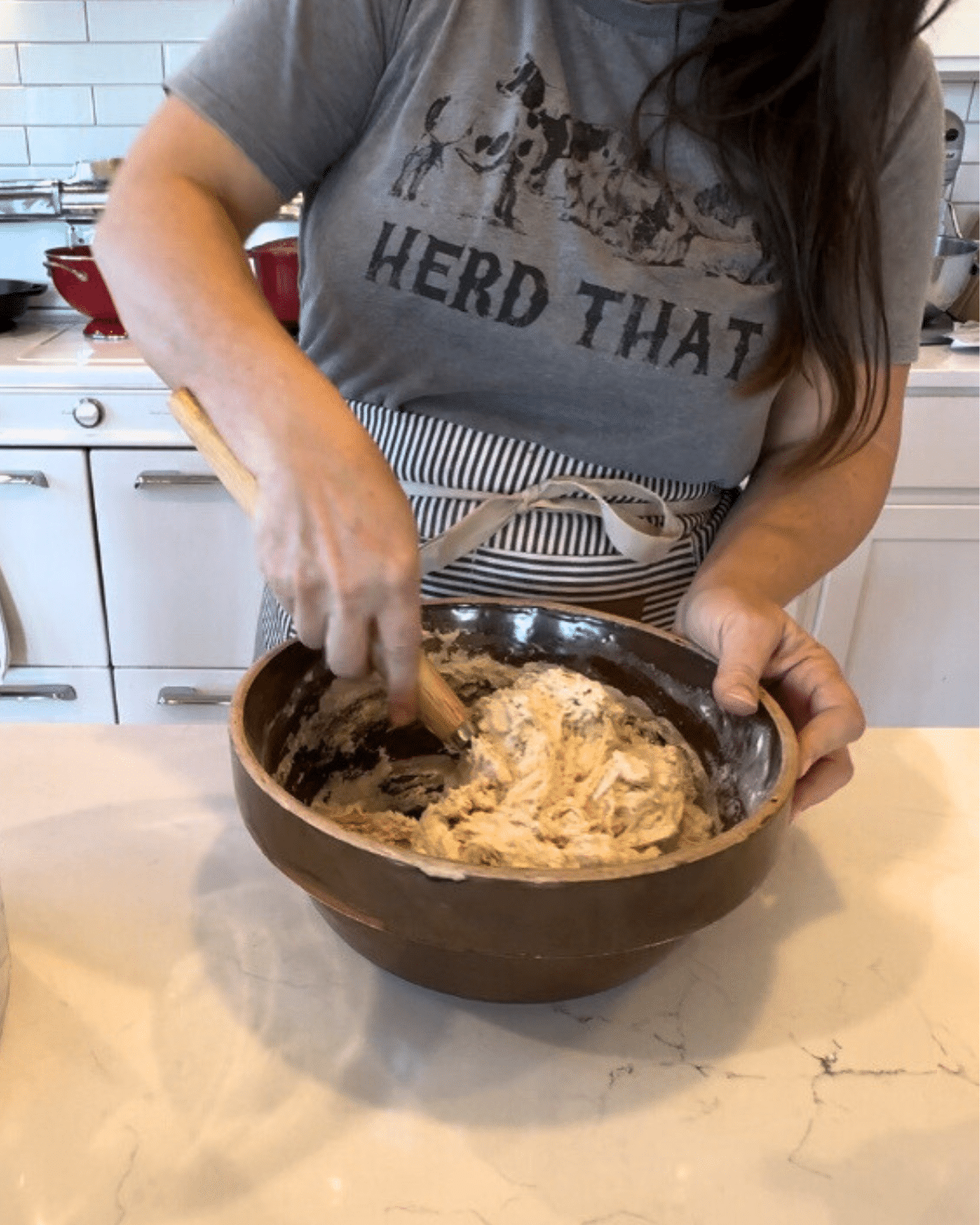 Add the flour to the water and starter mixture. I like to use my hands or a dough whisk to combine until shaggy… It’s therapeutic, but you can also use a mixer. Just remember it should be shaggy when you’re done, not smooth and elastic.