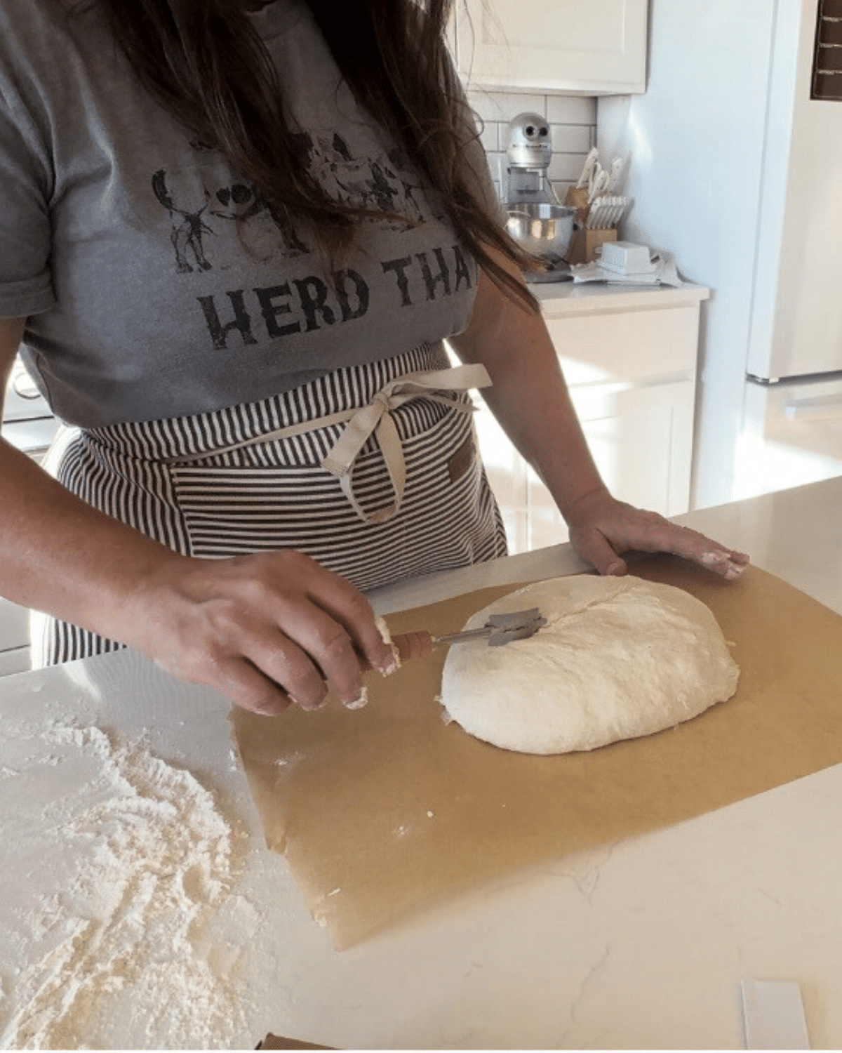 Place Dough – Lift scored dough by the parchment paper, and place it in the hot Dutch oven with the parchment paper, and place the hot lid on top.