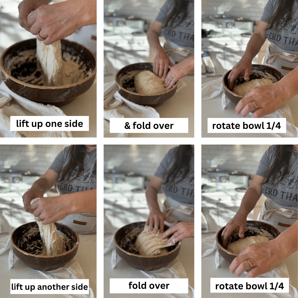 Stretch and folds are a traditional method used in sourdough breadmaking to develop the gluten in the dough! It helps distribute the wild yeast, and develops gluten for a strong, elastic dough that rises evenly to hold its shape!